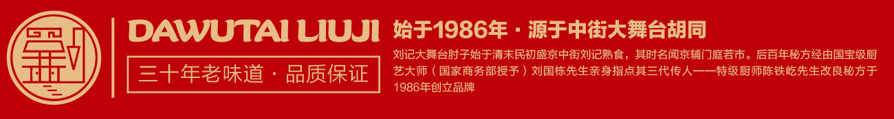 品牌創始人陳鐵屹先生自幼師承遼菜正宗,以發揚傳承遼味為己任。1986年,陳鐵屹先生經師傅指導調制出第一鍋醬湯,自此開始制作熟食,并于市井銷售,食客絡繹不絕。作為中華美食的傳承者、開拓者和創新者,陳鐵屹先生于80年代創立“劉記大舞臺肘子”品牌,開出了第一家門店?;诎倌昝胤絺鞒懈牧迹⒉捎眯迈r放心原料,秘用二十幾味名貴藥材,延用傳統工藝專心加工而成,形成了色澤艷麗,酥爛脫骨,肥而不膩,瘦而不柴的風味產品。